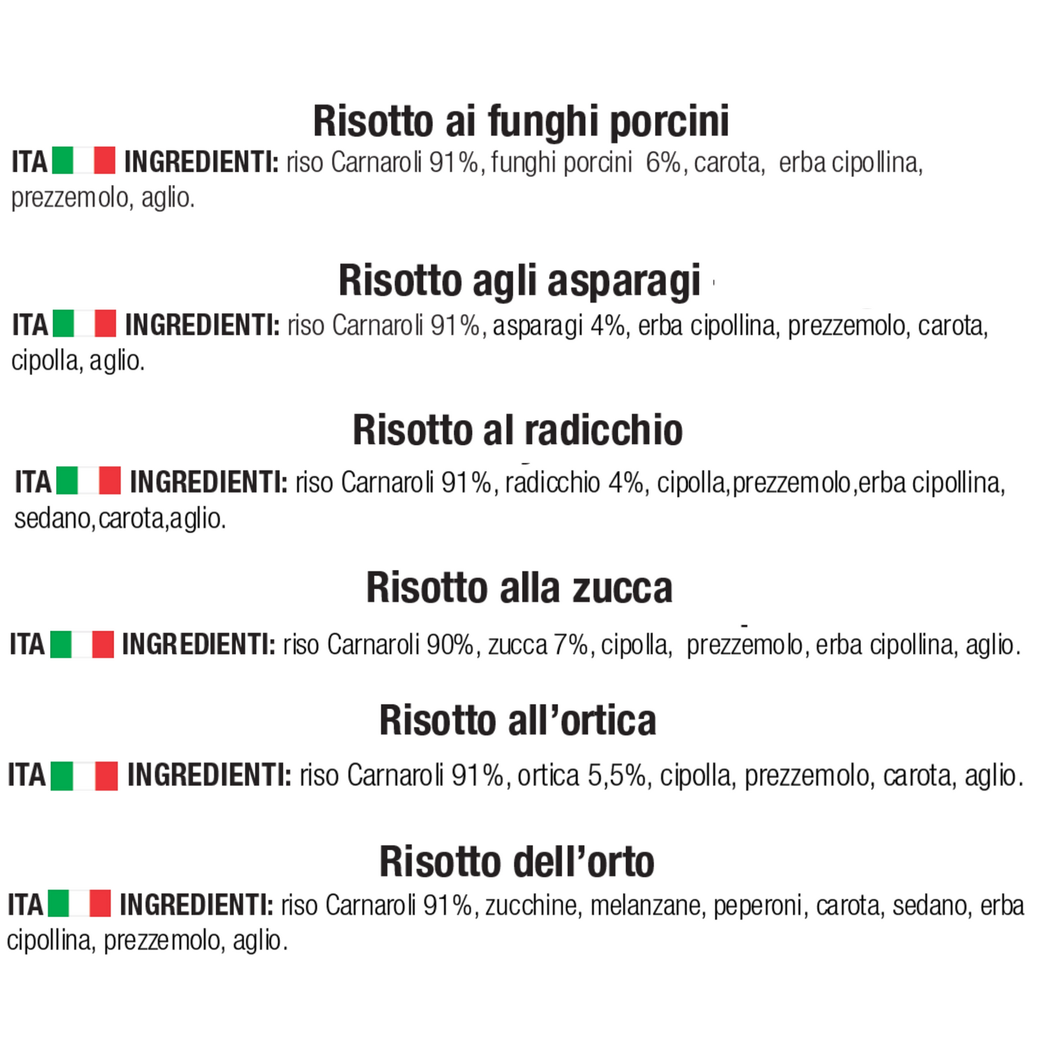 - Varietà di Gusti: Sei diversi risotti che spaziano dai sapori più classici come il risotto ai funghi porcini, ai gusti più particolari come il risotto all'ortica.